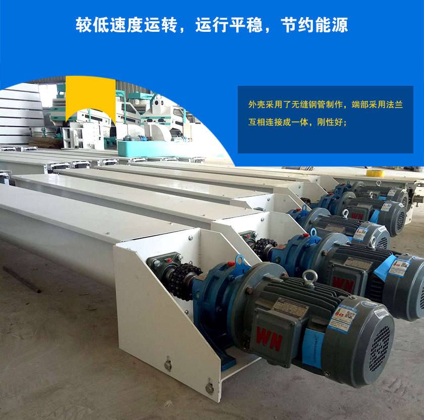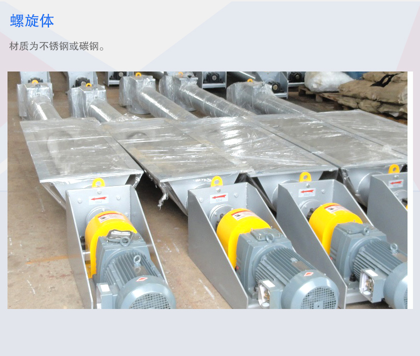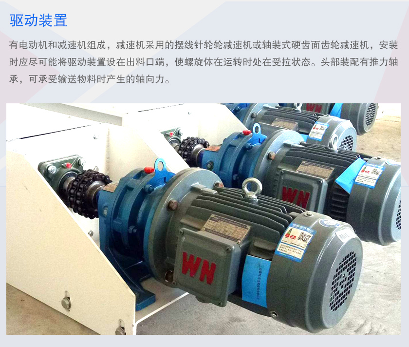 驅動裝置:有電動機和減速機組成,減速機采用的擺線針輪輪減速機或軸裝式硬齒面齒輪減速機,安裝時應盡可能將驅動裝置設在出料口端,使螺旋體在運轉時處在受拉狀態。頭部裝配有推力軸承,可承受輸送物料時產生的軸向力。