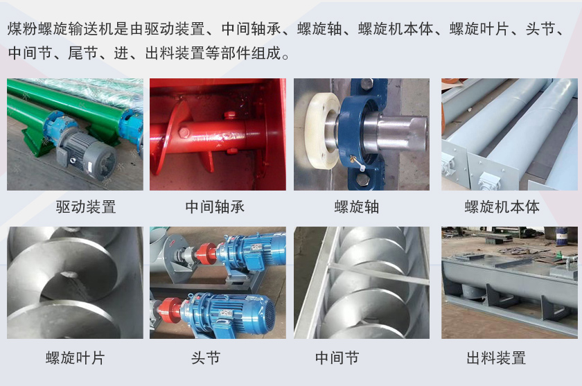 煤粉螺旋輸送機是由驅動裝置、中間軸承、螺旋軸、螺旋機本體、螺旋葉片、頭節、中間節、尾節、進、出料裝置等部件組成。